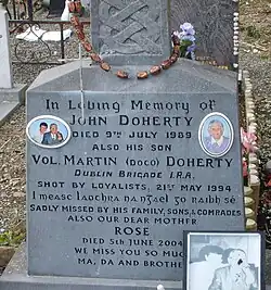 An inquest into Doherty's death in November 2004 returned a verdict of unlawful killing by person or persons unknown.[13] In 2006 a Garda superintendent stated the investigation into Doherty's death was ongoing, and that "We still have an unsolved murder and the file remains open. To date, no one has been made amenable".[14] Doherty's family believe the Irish authorities are withholding key information about the case, and are demanding answers from the Irish government.[14] Sinn Féin justice spokesman Aengus Ó Snodaigh pledged to raise this issue with the Minister for Justice, Equality and Law Reform, stating "Clearly the Irish government has very serious questions to answer about the ability of unionist death squads, led frequently by British agents, to attack and target Irish citizens with apparent impunity in this jurisdiction".[14] Doherty is regarded as a martyr by Irish republicans, with the Clonakilty cumann of Sinn Féin and the Martin Doherty Republican Flute Band named after him in Govan Glasgow,[15][16] as well as the Nassau County chapter of the Irish Northern Aid Committee in the United States.[17] An annual commemoration march from the Dick McKee memorial in Finglas village to nearby Glasnevin Cemetery takes place each year.[10][18]
