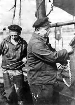 In the Netherlands he bought the old Dutch fishery vessel ZK 14, which he named Krake (= octopus). Henceforward he deployed it as his floating poet's workshop to sail the shallow waters of the coastal regions of The Netherlands, Germany, Denmark, Southern Norway and Southern Sweden.[48] In the harbours he opened his ship for tale-telling and readings.[49] Mostly young people visited his ship, some attended during trip sections.[50] One of the later well-known listeners and passengers was Beate Uhse, one of his former pupils.[51][52] In 1935 he got awarded with Literaturpreis der Reichshauptstadt Berlin (= literature award of Reich's capital Berlin) for his historic novel Hasko which was published in German, Dutch and French.[53] He also wrote his most favourite book Obadjah und die ZK 14 and a Viking trilogy.