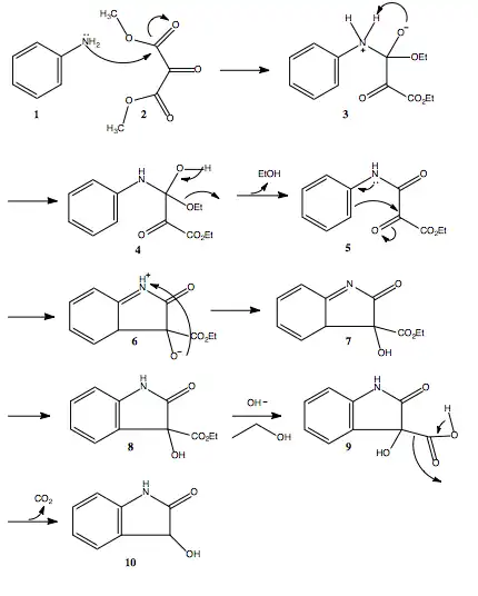 In the first step, the amino group on the aniline (1) attacks the carbonyl of the ethyl oxomalonate (2). A proton from the nitrogen is extracted by the oxygen and an alcohol group forms (3). The carbonyl re-forms to make a keto group and an ethanol molecule leaves (4). Next, a ring closing reaction occurs by the bond from the aromatic benzene ring attacking the partially positive carbonyl to form a five-member ring (5). After a proton transfer (6), an isomerization or a [1,3] hydride shift occurs and aromaticity is restored to the six-membered ring (7). In the presence of base, the ester is hydrolyzed, ethanol is lost (8) and a decarboxylation occurs (9). The resulting product is the desired dioxindole (10).[3]