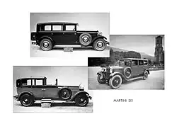 The post-war recession, however, crippled Swiss exports including those of Martini. Martini was one of a very few manufacturers to restart production, with a mildly warmed over pre-war design as the TF 15/45 PS.[3] A conventional four-cylinder of 3.6 litres displacement, it was wholly outdated in spite of a high standard of finish, with sales beginning at a low pace and then steadily sinking. Swiss manufacturers, with only a tiny domestic market, had been heavily export-dependent but external markets vanished in the harsh economic climate of the early 1920s. In June 1924 the nearly bankrupt Martini company was taken over by the Steiger brothers of Burgrieden, Germany.[4] The Steigers relocated to Switzerland, having seen the writing on the wall for their German company which closed down in 1926, forcing the Steigers to sell their home to satisfy the creditors.[5] The old TF soldiered on until 1925, but at the 1926 Geneva Motor Show Walther Steiger was able to show the new Martini-Steiger FU six-cylinder car.[6] This had a side-valve engine of 3.1 litres and was a fully modern automobile albeit without any technical advances. It entered production in 1927, along with the larger (4.4 litres) FUS model. While sold as the "Martini Six" at home, the "Steiger" (meaning "Climber", suitably enough for a Swiss car) part of the name was emphasized in export markets where it was the "Steiger-Martini." Steiger's Alpine Chamois buck was incorporated into the logo and was also used as a hood ornament.[6]