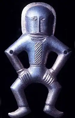 The hoard includes four anthropomorphic silver figurines of 'dancing men' (Ukrainian newspapers sometimes refer to them as 'aliens' for their unusual appearance[3]), five animal figurines, three fibulas, a radiate-head brooch, six armlets, tiaras, ear rings, neck rings, buckles, belt-fittings and horse harnesses. The style of figurines is sometimes considered as influenced by Huns, Bulgars or Avars.[4]