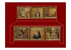 Another possible reconstruction was an arrangement over the altar of the six panels representing the saint in two rows of three panels each, to cover a niche containing the relics, which could be opened to show the relics and the panels with the red background.[2]