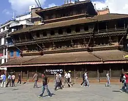 On the eastern side stands Dhansā Degah (धन्सा देग:) (alternative name: Dhunsar), a 17th-century pagoda-shaped building. Its carved wood windows provide a specimen of the art of woodworking which has been highly developed in the Kathmandu Valley since ancient times.[5] The upper part was destroyed in the great earthquake of 1934, and its height was shortened when it was repaired. It was originally a courthouse.[6] A shrine to Nāsa Dya (नास: द्य:), the god of music, exists on the ground floor.