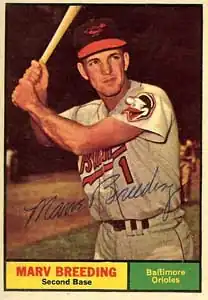 Marv Eugene Breeding (March 8, 1934 – December 31, 2006) was an American professional baseball second baseman who played four seasons in Major League Baseball (MLB) for the Baltimore Orioles, Washington Senators and Los Angeles Dodgers between 1960 and 1963.[1] He batted and threw right-handed and was listed as 6 feet (1.8 m) tall and 175 pounds (79 kg).