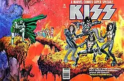 The premiere issue, dated simply 1977, featured the rock band Kiss in a 40-page story written by Steve Gerber, penciled by John Romita Jr., Alan Weiss, John Buscema, Rich Buckler, and Sal Buscema, which saw the quartet battling Marvel supervillains Mephisto and Doctor Doom.[1] The members of the band had samples of their blood mixed into the ink used to print the first issue.[2][3] Kiss reappeared in an occult adventure in issue #5 (1978). With that issue, the series' title in its postal indicia was shortened to Marvel Super Special.[4]