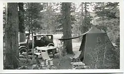 With Northern California as a permanent base, Yerkes now painted for herself. She had ready access to some of the West's greatest natural wonders. She traveled, camped and painted from Yosemite Valley to Santa Fe and from Tucson to Alberta, Canada. Travelogues, kept by her husband, showed detailed records of these adventures all throughout the 1930s and 40s. They toured in their specially modified 1920s Buick which was equipped with extra storage pockets and a canvas sling for an interior bed.[12] Yerkes, her husband, and their daughter Mary, (nicknamed Min), spent weekends and holidays traveling on dirt roads to explore the inner sanctums of the newly established National Parks. Extended expeditions took them several times throughout the West and they toured many National Parks including; Crater Lake, Mt Rainier, Glacier, Yellowstone, Grand Teton, Rainbow Bridge and Arches, Mesa Verde, Joshua Tree, Death Valley, Grand Canyon, Organ Pipe Cactus National Monument and Yosemite, as well as the Oregon, Washington and California coasts.[13] Yosemite Valley was a particular favorite subject matter and destination because of its beauty and proximity to San Mateo.