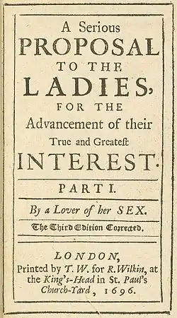 - A Serious Proposal to the Ladies for the Advancement of their True and Greatest Interest. By a Lover of Her Sex. 1694, 1695, 1696 1697 (two printings), 1701, 1703