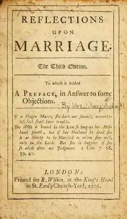 - ^ Astell, Mary, 1668–1731, Some Reflections Upon Marriage, Occasioned by the Duke and Dutchess of Mazarine's Case; Which is Also Considered, London: Printed for John Nutt, near Stationers-Hall, 1700.
