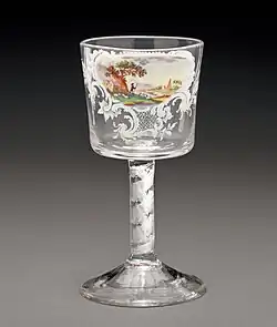 Beilby ware involves fine enamelled designs on glass including rococo flourishes, landscape vignettes, and heraldic designs.[4] Although Mary's contribution is acknowledged, it is difficult to identify exactly which pieces she decorated.[5][6]