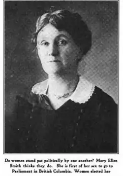 Mary Ellen Spear Smith (October 11, 1863 – May 3, 1933) was a politician in British Columbia, Canada. She was the first female Member of the Legislative Assembly (MLA) in the Legislative Assembly of British Columbia,[1] and both the first female cabinet minister[2][3] and the first female Acting Speaker[4] and the first woman cabinet minister in the British Empire.[5]