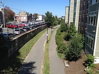 Originally, the line in East Boston was built for industrial usage by the Grand Junction Railroad and Depot Company. At points, the Greenway parallels the tracks of the former Boston, Revere Beach and Lynn Railroad, now the MBTA's Blue Line. After Conrail abandoned the tracks, the area became a dumping ground, and the area was first cleaned up by residents in 1978. Supported by the Lila Wallace-Reader's Digest Fund, the Boston Natural Areas Fund and local advocates, The Trust for Public Land started the process to acquire the abandoned rail corridor to transform into a greenway and bike trail.[2] In 1997, The Trust for Public Land received 1.2 miles of the corridor as a donation from Conrail. Mitigation funds from the Massachusetts Highway Department and EPA paid for the clean-up costs. A year later the first 1/2 mile segment was transferred from The Trust for Public Land to the city.[2]