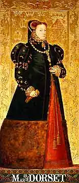 ![]() Mary Neville by Hans Eworth, 1555-1558, with an inset portrait of her first husband Thomas Fiennes dated a year before his death. | |