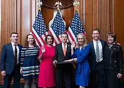 She was sworn into her 7th district seat on November 13, 2018,[15] in a ceremony attended by Hawa Salih, a Sudanese human rights activist whom Scanlon helped gain asylum in the U.S. She was one of four Democratic women elected to Congress from Pennsylvania in 2018. The others were Madeleine Dean, Chrissy Houlahan and Susan Wild. The state's congressional delegation had previously been all male.[16] She is only the third Democrat to represent this district and its predecessors since 1939.