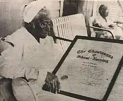 Gibson attended a correspondence school, the Chautauqua School of Nursing because segregated school in Texas did not offer degrees in nursing at the time.[1] When she graduated at age 53 in 1907, she became the first African American person in the Southern United States to earn an accredited nursing certificate.[3][1] In 1909, she lobbied the Texas legislature to pass educational and licensing standards for nursing.[2] Gibson worked to desegregate nursing as a profession.[4] She was involved in 1948 to help desegregate the American Nurses Association.[1]