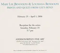 - Mary Lee Bendolph & Louisiana Bendolph: Prints and Quilts from Gee's Bend, Addison/Ripley Fine Art, Washington, DC, February 25 – April 1, 2006.
