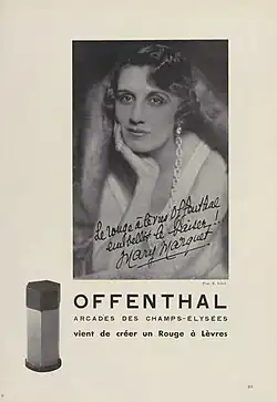In 1928 she became the face of a lipstick launched by Offenthal, claiming that "The Offenthal lipstick embellishes your kiss".