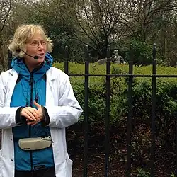 ![]() Mulvihill presents a guided tour in front of the Oscar Wilde statue, Merrion Square, Dublin, in March 2014 | |