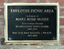 Mary Rose McGee died on March 5, 2004.[2] A commemorative plaque honoring her achievements stands outside of the employee picnic area at the Huntington Town Hall.