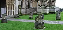 After the War, Watson received several public commissions, often for large architectural pieces. These included two commissions from the architect Sir Frederick Gibberd for Magic Beast for Crofton Common Infant School at Longbridge and for Chiron Teaching the Young Hero for Harlow New Town.[8] A visit to Greece in 1953 inspired Musician, a large Purbeck stone carving which was shown at the Royal Academy in 1955.[8] Seen by Sir Edward Maufe this led to a commission for two gilded limewood angels for Guildford Cathedral.[8] In 1958 Watson completed a commission for Cambridge University, creating a bas-relief series for the exterior of the Chemistry Faculty Building depicting the university arms and five alchemy symbols.[9] Her Four Symbols of the Evangelists, in Purbeck stone, now lead to the north entrance of Wells Cathedral.[2] In 2000, in the churchyard at Langton Matravers, Watson installed Purbeck Quarryman.[10] Watson exhibited with the Fine Art Society, at Foyles Gallery, at the National Society of Painters, Sculptors and Gravers, with the New Art Centre and the Women's International Art Club.[1][11] She had solo shows at Pelter/ Sands in Bristol, at the Dorset County Museum and a large retrospective at the Salisbury and South Wiltshire Museum, with pieces shown at Salisbury Cathedral, in 2004.[1][12]