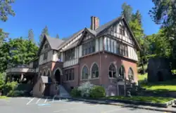 Located at 703 W. Seventh, the F. Lewis Clark House, or Undercliff House as it was called by Clark and is commonly known, is a Tudor Revival home designed by Kirtland Cutter and built in 1896. The home would host numerous high-society functions and social events in its early years. The home was designed to host gatherings like those, with its plans including a billiard room, a ballroom, a large porch on the northern façade overlooking the city, and formal English gardens with red brick paths that matched the brickwork on the home.[2] Like the other extant homes in the Marycliff section, it is located along the hillside overlooking downtown, though it is the farthest back of the remaining homes and closest to the basalt cliff. A number of basalt outcroppings are located around the home, some of which are close enough that they were included in Cutter's design for the structure.[12] A cistern was built adjacent to the home out of basalt rocks. There was also an ice house on the property as well as several greenhoues. Prior to the construction of Marycliff High School in 1929, the manicured lawns and gardens sloped down from the house to Seventh Avenue, where a gatehouse was located.[2]