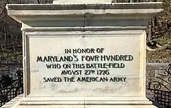 Unknown as to year, a tablet to commemorate the Maryland 400 was placed by the Sons of the Revolution[25] in the sidewalk of 5th Avenue. The bronze tablet is four and one-half by five feet.[25] It has since been incorporated in the north gable of the reconstructed house.[26] It reads: "Here on the 27th of August, 1776, Two hundred and fifty out of four hundred brave Maryland soldiers, under the command of Lord STIRLING, were killed in combat with British troops under CORNWALLIS."[27]
