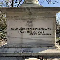 On the east face of the monument's square base is an inscription honoring the participating Maryland 400 soldiers. The inscription reads: "In honor of Maryland's four hundred who on this battlefield August 27, 1776 saved the American army." The west face of the marble pedestal has another inscription, which is a comment attributed to Washington as he watched the Marylanders hurl themselves at the enemy. It reads: "Good God! What brave fellows I must this day lose."