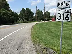 Maryland Route 316 (MD 316) is a state highway in the U.S. state of Maryland. Known as Appleton Road, the highway runs 2.67 miles (4.30 km) from MD 279 near Elkton north to MD 277 near Elk Mills in northeastern Cecil County. MD 316 was constructed in the early 1910s from Elkton to Elk Mills and in the early 1920s north of Elk Mills. In the early 1960s, the disjoint northern segment of the highway was transferred to the county and the highway's present southern terminus was established when MD 279 moved to a new alignment north of Elkton in the early 1960s.