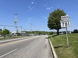 MD 781 begins at an intersection with US 40 (Pulaski Highway) in the town of Elkton 0.23 miles (0.37 km) west of the U.S. Highway's crossing of the Delaware state line. The highway heads north as a two-lane undivided road to the west of the state line and to the east of Grays Hill. MD 781 leaves the town of Elkton about halfway through its course, but the route follows a finger of unincorporated area between sections of the town to its northern terminus. That terminus is at MD 281 (Red Hill Road) 0.34 miles (0.55 km) west of that highway's crossing of the state line.[1][2]
