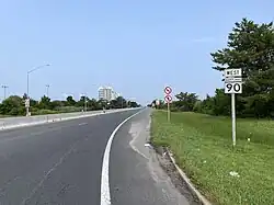 In 2009, Mayor Rick Meehan of Ocean City pushed for dualization of the MD 90 bridge, stating that it "is the quicker way in and out of town, especially if you look at all the development that has taken place along the Route 50 corridor." He also stated that dualization is good for the route for evacuation purposes.[23] On August 21, 2021, Governor Larry Hogan announced the state would advance plans to improve MD 90 that include widening the entire length of the road to a four-lane dual highway.[24][25] On June 13, 2022, Governor Hogan announced that $15 million in funding will be dedicated to expand MD 90 as part of the "Reach the Beach" plan.[26] In September 2024, the proposed widening of MD 90 was put on hold due to reductions to the state's transportation budget.[27] In April 2025, the MD 90 widening project was put back on the state's agenda, with preliminary design planned to begin in July 2026.[28]