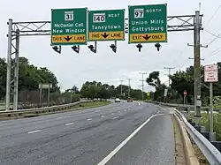 Past this intersection, MD 97 passes to the east of Carroll Community College and heads into residential areas as it approaches Westminster, bypassing the center of the town to the east.[2] The route becomes Malcolm Drive past the intersection with Main Street/Old Westminster Road and continues to an intersection with MD 140 (Baltimore Boulevard). Here, MD 97 makes a left turn to form a concurrency with MD 140 on Baltimore Boulevard, a six-lane divided highway.[1][2] The two routes head through commercial areas on the outskirts of Westminster, passing by the TownMall of Westminster before meeting MD 27 (Manchester Road) at a folded-diamond interchange.[2] Past this interchange, the road passes over the Maryland Midland Railway and heads past more businesses. At the Sullivan Road intersection, the road becomes College View Boulevard and a short distance later, MD 97 splits from MD 140 at an interchange near McDaniel College.[1][2]