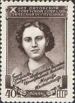 Marytė or Marija Melnikaitė (18 March 1923 – 13 July 1943) was a Soviet partisan and the only Lithuanian woman awarded Hero of the Soviet Union.[1] While her partisan career lasted less than two months, Soviet propaganda exaggerated her duties and accomplishments. Many works, including a film and an opera, were dedicated to her. Several streets in the former Soviet Union (including Tyumen, Minsk, Almaty, Shymkent) are still named after her.