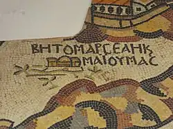 The Talmud discusses the marzēaḥ as a living institution.[53] The latest reference to the marzēaḥ is the Madaba Map from the 6th century AD:[4] the settlement ΒΗΤΟΜΑΡΣΕΑ Η ΚΑΙ ΜΑΙΟΥΜΑΣ (Bētomarsea ē kai Maioumas) shown in the map near the Dead Sea is identified as "House of Marzēaḥ".[53][69] Some link this place to Baʿal-Peʿor mentioned in the bible, who is the god of death.[69][70][71]