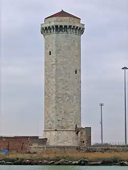 The Marzocco was such a powerful symbol of the Florentine Republic that the republican Florentine troops in the Siege of Florence (1529–1530) were known as marzoccheschi, "sons of the Marzocco",[8] and pro-Medici besiegers of the city in 1530 held a funeral and ritually buried a representation of it, with bells tolling.[9] Prisoners of war from Pisa were forced to kiss it in 1364.[10] At Anghiari, subject to Florence from 1385, the 15th-century Palazzo del Marzocco faces the church; at Montepulciano stands the Marzocco column; at Volterra the Marzocco stands against the Palazzo dei Priori, seat of government; at Livorno the 15th-century Torre del Marzocco (illustration, right) guards the harbor entrance; and at Pietrasanta there are a 16th-century Marzocco fountain and the Marzocco column, erected in 1513 when Pope Leo X awarded the commune to Florence.