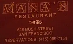 Masa's Wine Bar & Kitchen (also known as Masa's Restaurant or Masa's) was a new French restaurant located in San Francisco, California, in the United States.