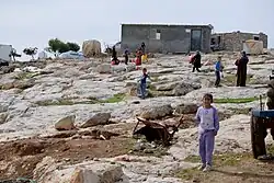 According to The Guardian, "Palestinian water cisterns, solar panels, roads and buildings here are frequently demolished on the grounds that they do not have building permits, which are nearly impossible to obtain, while surrounding illegal Israeli settlements flourish. The community are mostly herders, raising goats and sheep throughout scorching summers and freezing winters."[12] Bir el-Eid, which is closest to the unauthorized Israeli settlement Mitzpeh Yair, report having their cistern vandalized by having an animal carcass thrown into it. Palestinians said that "the Israeli settlers were believed to be behind the vandalism".[13]