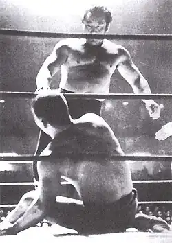 In the early 1950s, Kimura founded Kokusai Pro Wrestling Association.[13] He was also invited by Rikidōzan to compete as a professional wrestler in his Japan Pro Wrestling Association. They performed both as tag team partners and as opponents, but Kimura was not marketed or publicized as much as Rikidōzan. In 1954, their series of matches with the Canadian Sharpe Brothers, who were portraying foreign villains, were the first high-profile pro wrestling matches in Japan and led to a pro wrestling boom.[14][15]