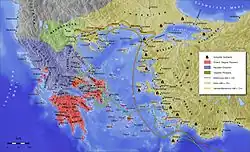 Pompeius Trogus, a later author, relates the same story, but refers to Artabazanes as Ariamenes.[16] On the other hand, Plutarch states that Xerxes, when he is chosen as heir, offers Ariamenes the position of "second after the king".[17] The Ariamenes who appears in Plutarch, although he plays the role of the Artabazanes referred to by Herodotus and the Ariamenes referred to by Trogus, has similarities with Masistes. First, Ariamenes governs over Bactria in Plutarch's version, just as Masistes does in Herodotus. Also, the phrase "second after the king" coincides with the meaning of the title mathishta, which seems to be related to the name of Masistes.[18] However, in Plutarch, the "second after the king" refers to the most powerful person after the king himself, but not to the heir, as occurs with the title mathishta.[19]