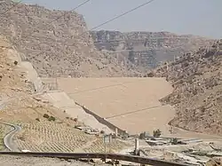 The Masjed Soleyman Dam (also known as Godar-e Landar Dam) is a dam in Iran on the Karun river. It is 177 metres (581 ft) high, has an installed capacity of 2,000 MW, and its reservoir holds 261,000,000 cubic metres (212,000 acre⋅ft) of water. The dam is a rock-fill structure with a vertical clay-core. The dam was built by Iran Water and Power Resources Development Co. and completed in 2002. The power station was built in two 1,000-MW stages. The first stage was complete in 2003 and the second in September 2007.[2][3] The dam was named after the town of Masjed-Soleyman, about 25 kilometres (16 mi) away. The spillway gates are believed to be the largest of their kind in the world.[4]