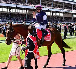 ![]() The horse prior to the 2013 Melbourne Cup, with jockey Michael Rodd. | |