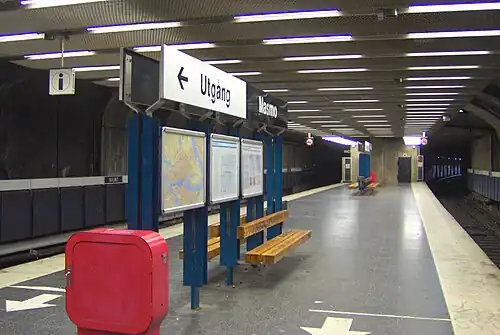Masmo metro station is a station on the red line of the Stockholm metro, located in Masmo, Vårby, Huddinge Municipality. The station was opened on 1 October 1972 as part of the extension from Vårberg to Fittja.[2] It was the first of the "grottstations" (cave-stations).[3] The distance to Slussen is 16.1 km (10.0 mi).