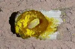 Within a few days of mating, the female has selected a nest site and has begun to visit flowers to gather pollen and nectar for her nests; many trips are needed to complete a pollen/nectar provision mass.[6] Once a provision mass is complete, the bee backs into the hole and lays an egg on top of the mass.[7] Then, she creates a partition of "mud", which doubles as the back of the next cell.[7] The process continues until she has filled the cavity.[7] Female eggs are laid in the back of the nest and male eggs toward the front.