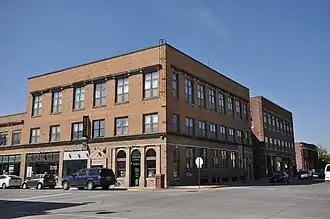 The building features multi-colored brick, symmetrical facades, pilasters for storefronts, cast stone columns that flank the main entrance, and a projecting band of cast stone above the third-floor windows. The building was individually listed on the National Register of Historic Places in 2016.[1] It was included as a contributing property in the Ames Main Street Historic District in 2018.[3]