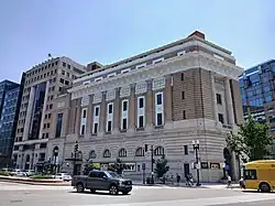 The 78,810-square-foot (7,322 m2) Masonic Temple is a Renaissance Revival style building.[7] The building was the headquarters of the Grand Lodge of the District of Columbia.[8] It replaced an older building constructed in 1870 at 9th and F streets (which as of 2013 was still standing). Initially drafted by architect Waddy B. Wood, the main building was completed in 1908 in an effort to bring the City Beautiful movement to Washington, D.C. Wood was recognized as being especially supportive of women architects during his lifetime. The lot that was known as "Seven Oaks" was bought for $115,000 in 1899. As the building was originally designed, the upper floors were reserved for Masonic rites, the middle floors were office space, and an auditorium on the first floor was meant to be rented out as a source of income.[7] The building began showing silent films in 1916, following a renovation.[9] From 1941 until 1983, the auditorium was used as a public movie theater.[7][9]