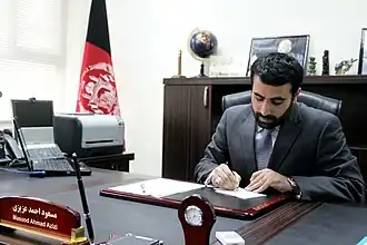Major General Masood Ahmad Azizi (Pashto: مسعود عزیزی; born 1983) is an Afghan politician[2] and is a former Consul General of Afghanistan in Dubai & Northern Emirates in the UAE.[1] Prior to that he was Deputy Interior Minister for Policy and Strategy.[3] Azizi previously served as the Chief of Staff of the Governor of Nangarhar and Kandahar.[4]