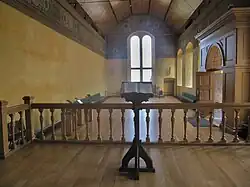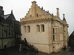 The buildings that formed the backdrop for the events of the baptism are still intact with few external changes since 1594. The interiors of the Great Hall, Chapel Royal, and Palace have been returned to their original layout and proportions, and subdivisions made during the later use of the castle as army barracks removed. The rooms in the palace were restored in 2010.[146] Painted decoration surviving in the Chapel Royal by Valentine Jenkin mostly dates from 1629 and shadow traces of paintwork from 1594 can be seen on the exterior around the windows.[147] The Prince's Tower, adjacent to the Palace, was also refurbished with new floors at this time.[148][149] No furnishings from 1594 are known to survive, except a plain oak pulpit possibly used by Patrick Galloway and David Cunningham, which is stored by Historic Environment Scotland.[150]