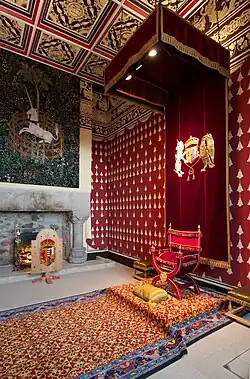 An ordinance for the arrangement of furnishing and seats in the chapel survives, the "Form and Ordering of the Chapel for the Baptism".[43] An account for furnishing textiles records that the king's seat and nine seats for ambassadors on the stage at the upper end of the Chapel Royal were provided with cushions and desk cloths made in ten different colours of velvet by the court embroiderer William Betoun. James VI sat on a cushion of "incarnadin vellvot perlit with sillver" - pink velvet edged with silver embroidery. The place for the ambassador from Brunswick was green.[44] A vacant seat in the chapel next to the king was reserved for the French ambassador.[45] The Dutch ambassadors Brederode and Valcke found their seat was decorated with the wrong coats of arms, and they asked for the arms of Holland and Zeeland to be taken down and replaced with the shields of the six United Provinces.[46] Fowler's published account in the True Reportarie understandably does not include this mix-up.[47]