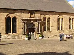 The architectural spaces of August 1594 can still be explored and experienced by visitors today. The Chapel Royal was purpose-built in 1594 under the direction of William Schaw, who was Master of Work to the king and the queen, and an administrator of the queen's landed income.[151] Some of the timber was selected on the Shore of Leith by the king's carpenter James Murray, elder.[152] The building has a central triumphal arch as an entrance, flanked by Italianate windows, and can be described as the first Renaissance style church in Britain.[153] The north façade is featureless. An older chapel on the site was judged inadequate for its bad proportions by a previous Master of Work Robert Drummond of Carnock in May 1583.[154] Ian Campbell and Aonghus MacKechnie argue that the proportions of the new building and a partition or barrier in the original interior mentioned by William Fowler matched ratios in the Bible for the measurements of the Temple of Solomon.[155] James VI had been compared to Solomon by his courtiers and poets, and while the chapel was being built John Colville described it in a letter as "the great Temple of Solomon".[156] However, this connection was not developed in William Fowler's description of the baptism pageant. Campbell and MacKechnie propose that the physical embodiment of the Temple in the architecture, rather than the allusion to kingship made by Colville, was a secret kept by the masons.[157]