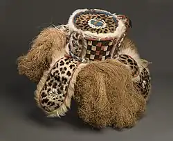 Gbini wears a large leopard skin which indicates its association with the paramount chief. The flat, round headpiece resembles the chief's crown. The headpiece is constructed of animal hide stretched over a bamboo framework. The hide is decorated with cowrie shells and black, white and red strips of cloth that are worked into a geometric pattern. At the center is a round mirror. Several flaps that are similarly decorated hang down from the base of the headpiece and overlap the raffia cape which covers much of the wearer's torso.[1]