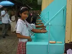 To increase the benefits of mass deworming and to lower the rate of reinfection, accompanying measures of mass deworming programmes should include water, sanitation and hygiene (WASH) interventions.[16] A good example for such a combined intervention is the Essential Health Care Program implemented by the Department of Education in the Philippines: This national programme combines twice annual deworming of school children with group handwashing with soap at set times of the day at the school premises.[17][18] This so-called "Fit for School" approach has also been implemented in Indonesia in 2014.[17]