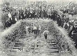 A mass grave is a grave containing multiple human corpses, which may or may not be identified prior to burial. The United Nations has defined a criminal mass grave as a burial site containing three or more victims of execution,[1] although an exact definition is not unanimously agreed upon.[2][3][4] Mass graves are usually created after many people die or are killed, and there is a desire to bury the corpses quickly for sanitation concerns. Although mass graves can be used during major conflicts such as war and crime, in modern times they may be used after a famine, epidemic, or natural disaster. In disasters, mass graves are used for infection and disease control. In such cases, there is often a breakdown of the social infrastructure that would enable proper identification and disposal of individual bodies.[5]